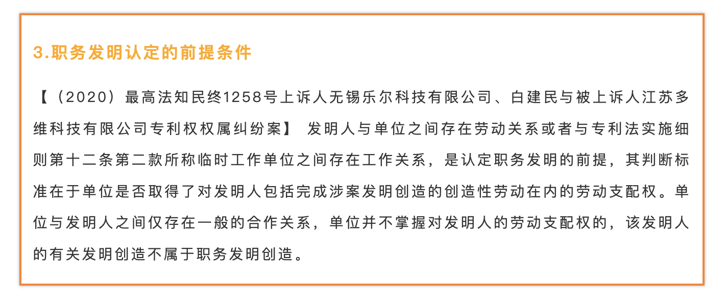 三聚陽光及旗下易聚律所代理的【(2020)最高法知民終1258號上訴人無錫樂爾科技有限公司、白建民與被上訴人江蘇多維科技有限公司專利權(quán)權(quán)屬糾紛案】所涉及的職務(wù)發(fā)明創(chuàng)造的認(rèn)定條件極具典型性而得以入選。