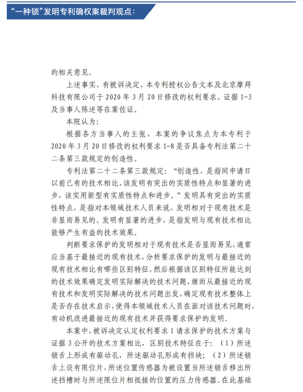 近日,北京知識(shí)產(chǎn)權(quán)法院發(fā)布了《專(zhuān)利確權(quán)授權(quán)審判案析2014-2024》,從其十年間審結(jié)的逾一萬(wàn)件專(zhuān)利確權(quán)授權(quán)案件中,精選了58件具有指導(dǎo)意義的案例,并提煉出20條案析規(guī)則,為業(yè)界提供明確的司法指引。三聚陽(yáng)光代理的“一種鎖”發(fā)明專(zhuān)利確權(quán)案因其典型性入選,為專(zhuān)利創(chuàng)造性的判斷提供了有力示范。