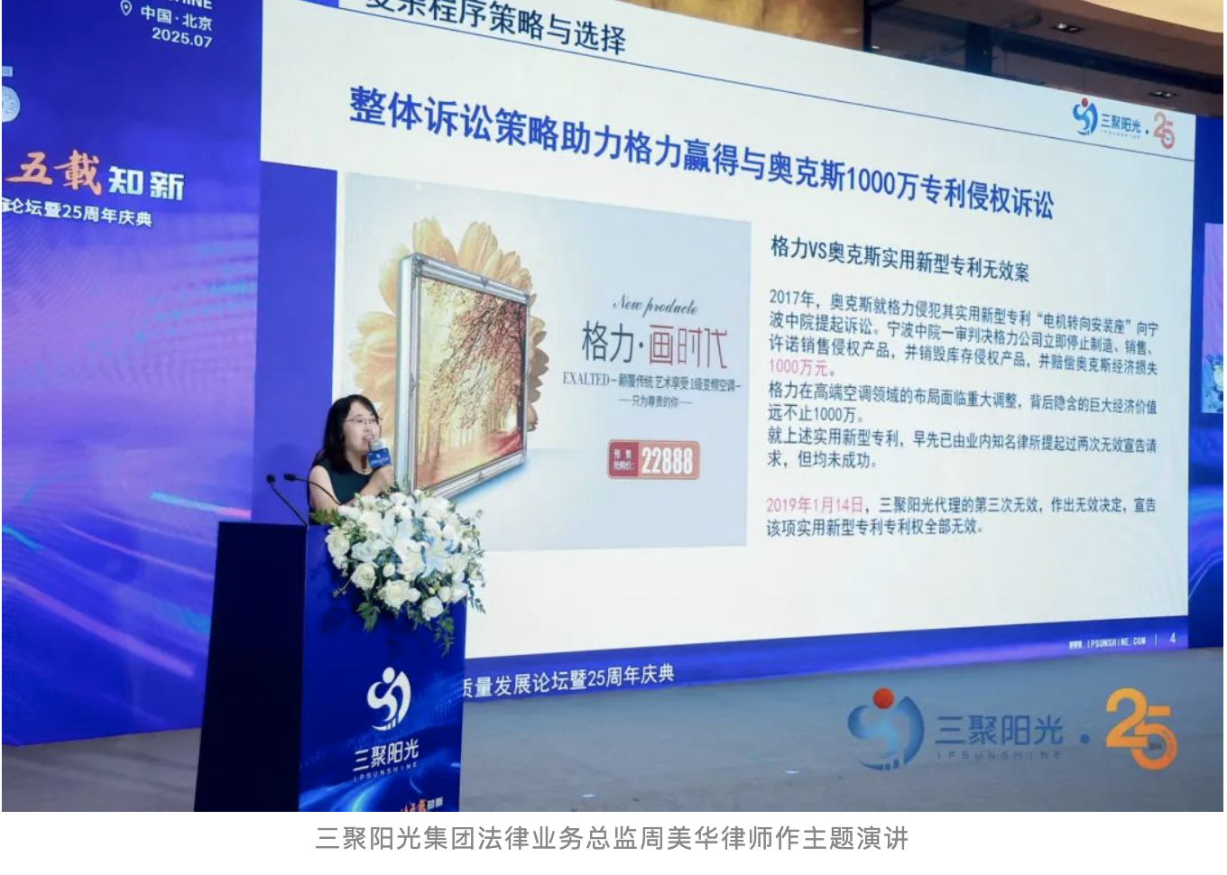 三聚陽(yáng)光集團(tuán)法律業(yè)務(wù)總監(jiān)周美華律師在《專利訴訟策略與實(shí)施》的主題演講中,通過(guò)多個(gè)具體案例深入探討了如何有效應(yīng)對(duì)復(fù)雜的專利糾紛,并分享了寶貴的實(shí)戰(zhàn)經(jīng)驗(yàn)。她回顧了格力與奧克斯的經(jīng)典專利侵權(quán)糾紛案件,展示了復(fù)雜訴訟程序及策略選擇對(duì)最終勝訴的重要性,詳細(xì)分析了多輪反制措施的應(yīng)用,如提起專利權(quán)屬訴訟、無(wú)效宣告等手段,并展示了如何利用國(guó)外證據(jù)成功使對(duì)方專利全部無(wú)效。