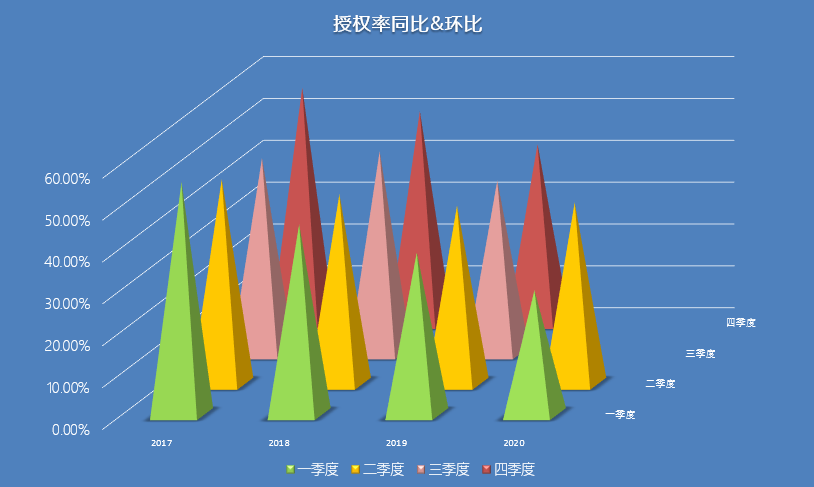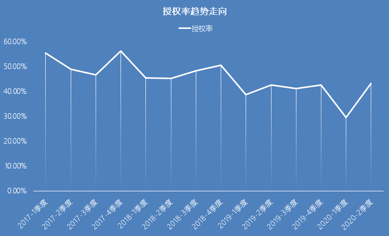 如圖3、圖4所示,授權(quán)率近年來(lái)整體呈下降態(tài)勢(shì),除2017年第一、四季度明顯高于第二、三季度,各年授權(quán)率環(huán)比相對(duì)平穩(wěn),而三年來(lái)同比則成明顯下降趨勢(shì),2017年一季度授權(quán)率為55.5%,而到2020年一季度授權(quán)率只有29.6%,不過(guò)2020年二季度授權(quán)率回升到43.3%。