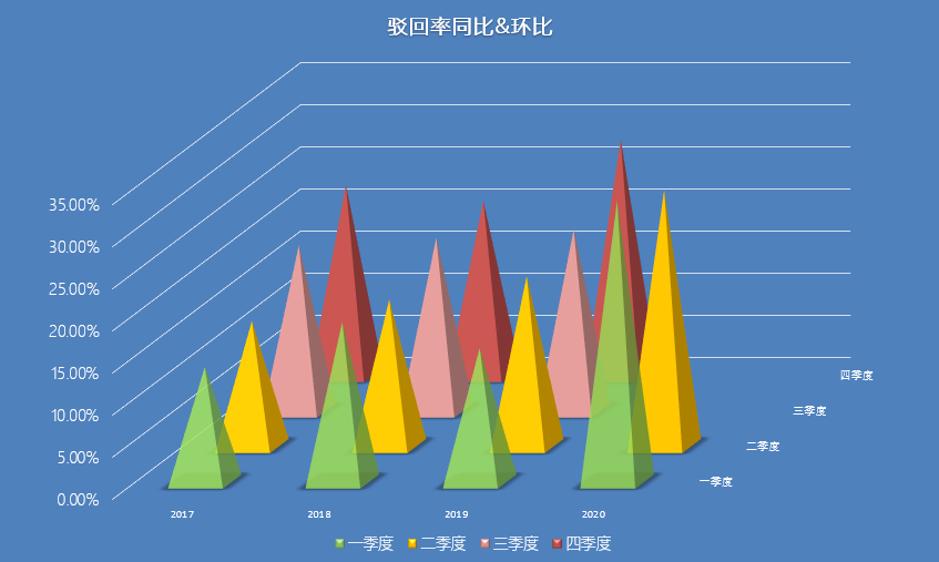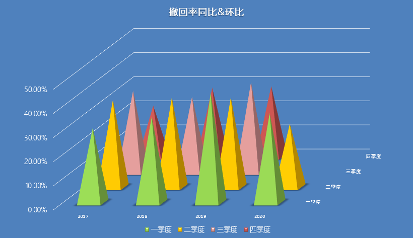 相較之下,撤回率近年來(lái)波動(dòng)明顯。如圖7、圖8所示,撤回率通常上半年高于下半年,2019年第一季度撤回率曾一度達(dá)到45.5%,而各年度第四季度撤回率則均出現(xiàn)較明顯下降,2020年第一季度撤回率與往年第一二三季度的均值差距不大,但第二季度撤回率下降明顯,僅為26.3%,略高于2017年第四季度視撤率谷值21.1%。