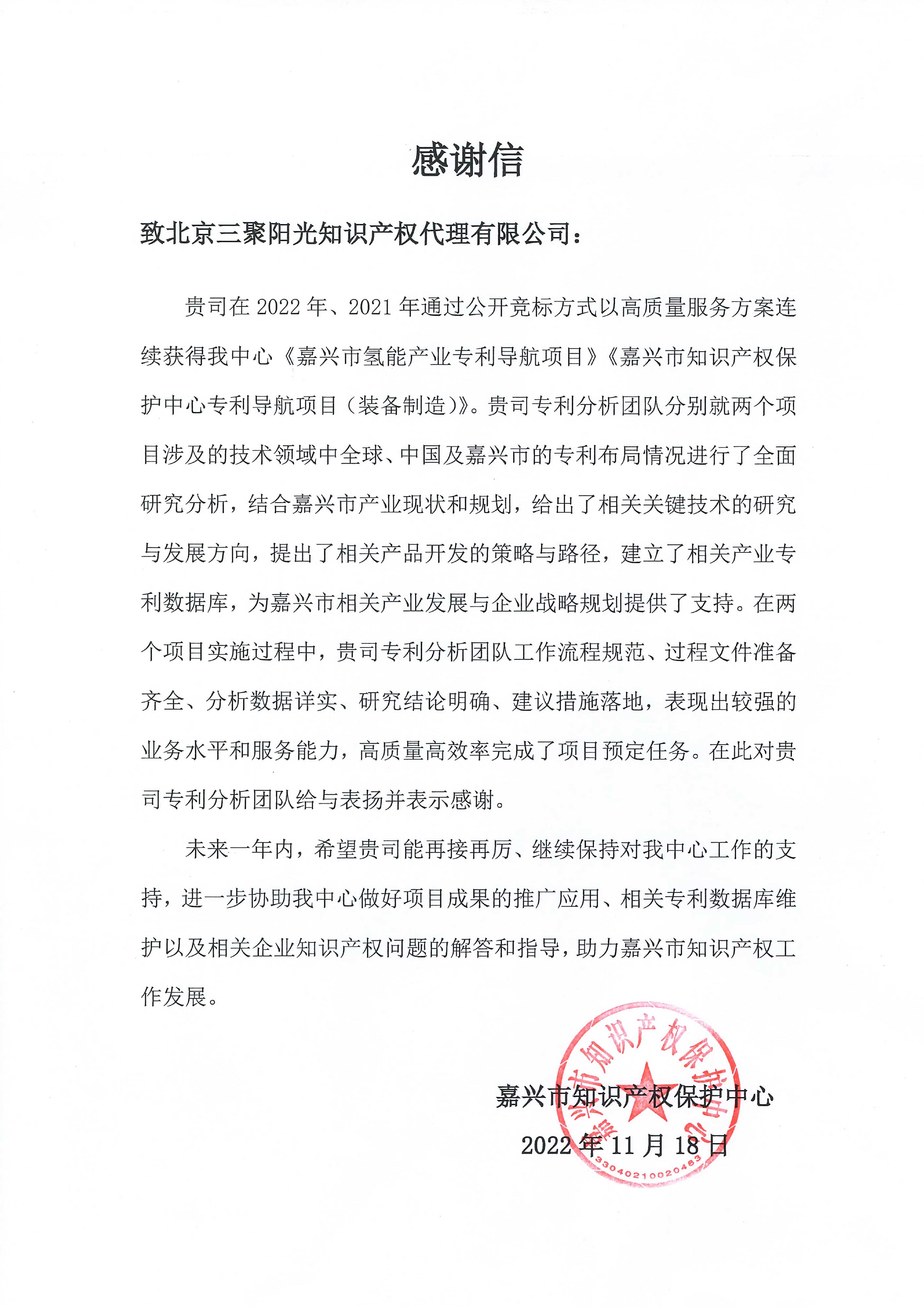 三聚陽光收到嘉興市知識產權保護中心感謝信