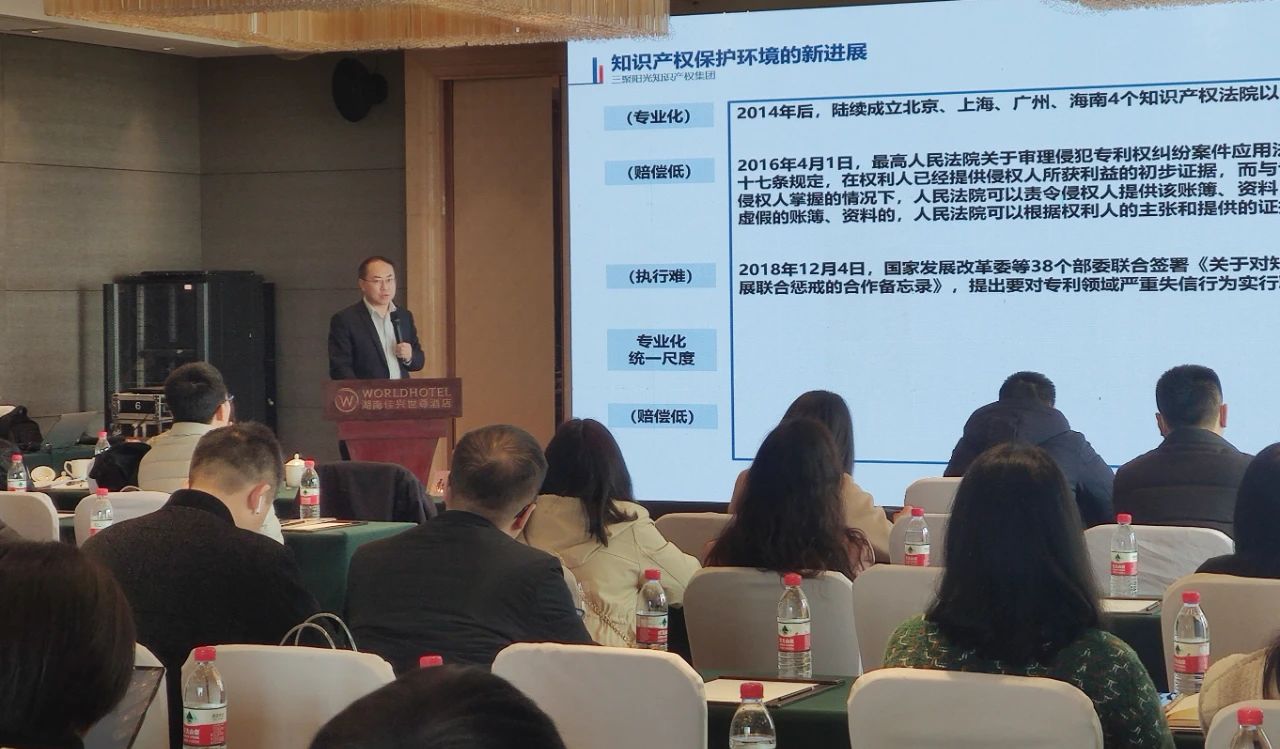 日前,由湖南省知識產(chǎn)權(quán)協(xié)會主辦、三聚陽光長沙公司承辦的“企業(yè)國內(nèi)外貿(mào)易中專利訴訟與應(yīng)對策略研討會”成功舉辦。國家知識產(chǎn)權(quán)局原局長、中國知識產(chǎn)權(quán)研究會原理事長田力普,湖南省知識產(chǎn)權(quán)協(xié)會常務(wù)副理事長、湖南省知識產(chǎn)權(quán)局原副局長劉躍紅,三聚陽光董事長張杰受邀出席活動。三聚陽光總裁張建綱、北京易聚律師事務(wù)所主任律師周美華作主題分享。三聚陽光副總裁朱正強(qiáng)主持研討會。