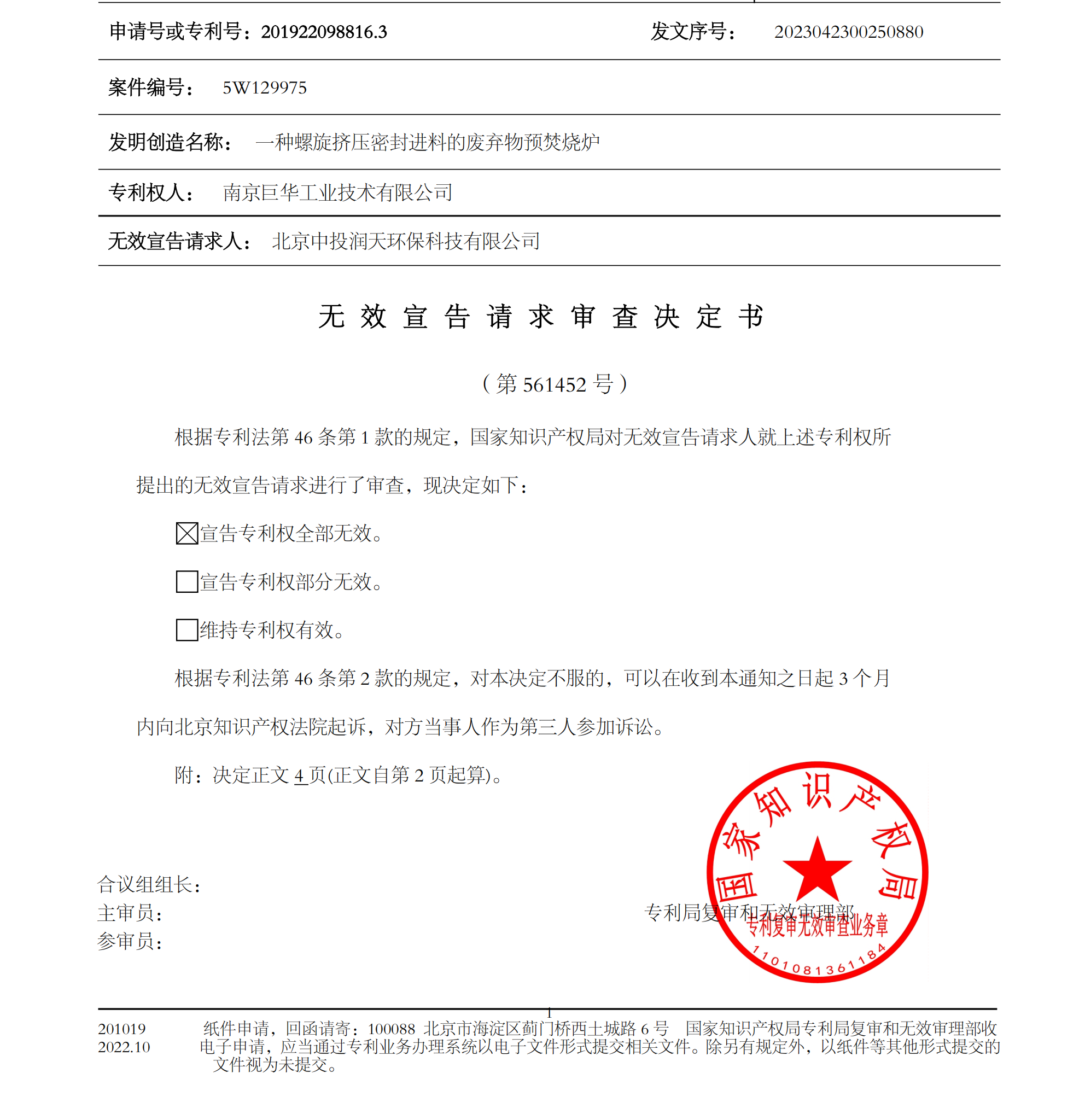 近日,由北京三聚陽光知識產(chǎn)權(quán)代理有限公司和北京易聚律師事務(wù)所聯(lián)合代理北京中投潤天環(huán)??萍加邢薰镜膶@麩o效宣告勝利結(jié)案。國家知識產(chǎn)權(quán)局作出第 561452 號無效審查決定,宣告南京巨華工業(yè)技術(shù)有限公司擁有的“一種螺旋擠壓密封進(jìn)料的廢棄物預(yù)焚燒爐”實(shí)用新型專利權(quán)全部無效。