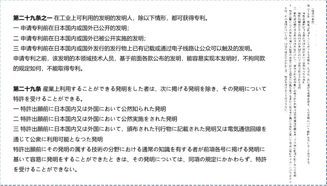 日本對新穎性的定義主要基于第二十九條,原文如下圖。該條法案被認為提出了授予專利的條件,包括實用性(“工業(yè)上可利用”)、新穎性(列舉現(xiàn)有技術(shù)情形)、創(chuàng)造性(基于現(xiàn)有技術(shù)容易實現(xiàn)的不可專利)。