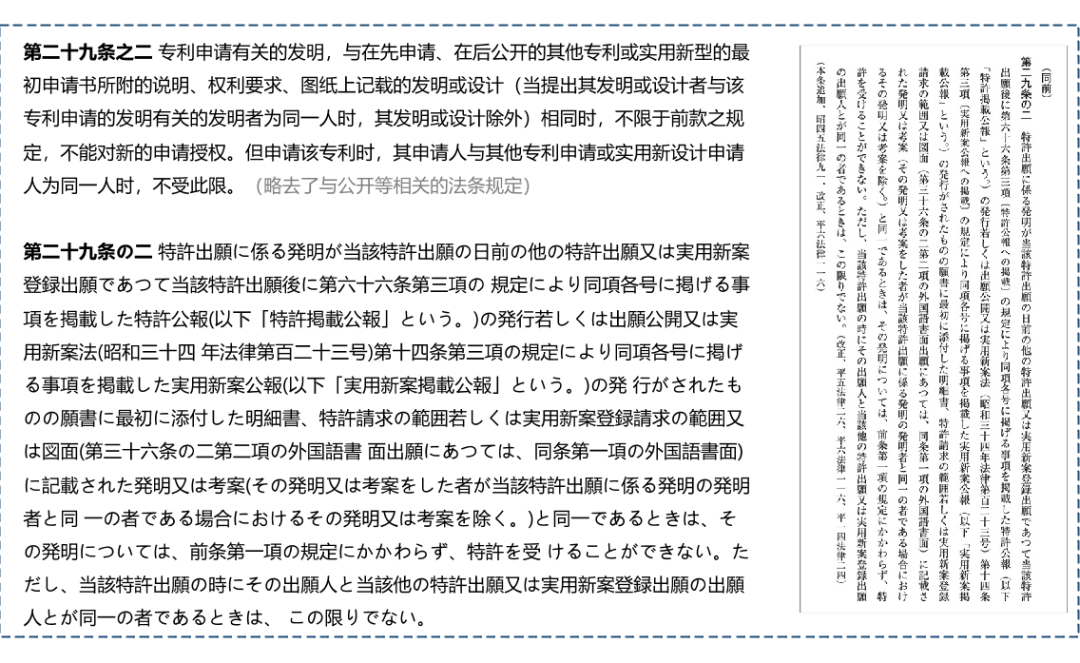 特別要注意,由于以上歷史原因,日本的“抵觸申請”條款不包含同一申請人或同一發(fā)明人的情形,所謂“相同”指代發(fā)明人完全相同或申請人完全相同。如果在先在后提交的兩份相同的申請的發(fā)明人全部相同或申請人全部相同,日本專利局不依據(jù)“擴大先愿”駁回,轉(zhuǎn)而依據(jù)第三十九條「先願」的先申請制度,基于在后申請沒有「新規(guī)性」駁回。駁回的結(jié)果一樣,只是依據(jù)不同。中國則沒有這一例外。