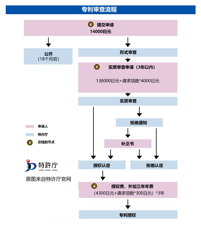 官費總計:發(fā)明專利,(授權(quán)+3年年費)約18萬日元,相當于9000人民幣;實用新型,(授權(quán)+3年年費)約2萬日元,相當于1000人民幣;外觀設(shè)計,41500萬日元起,與是否有秘密設(shè)計、年份等均有關(guān)。