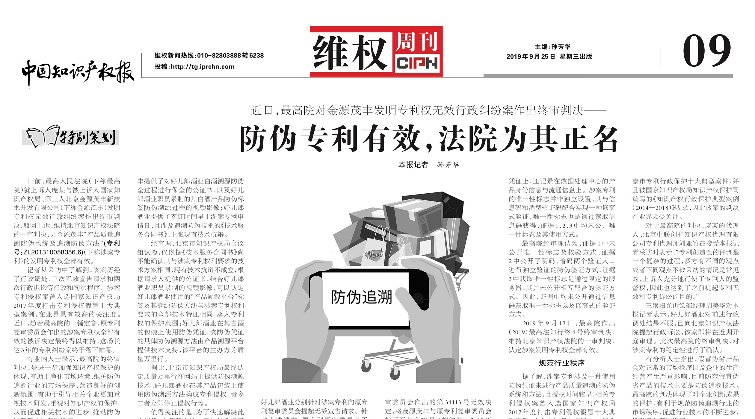 三聚陽光旗下易聚律所主任律師周美華接受知識產權報記者采訪時表示,好兒郎酒業(yè)對前述行政調處結果不服,已向北京知識產權法院提起行政訴訟,該案即將在近期開庭審理。此次最高院的終審判決,對涉案專利的穩(wěn)定性進行了確認。假冒偽劣產品會對正常的市場秩序以及企業(yè)的生產經(jīng)營產生嚴重影響,目前防范假冒偽劣產品的技術主要是防偽追溯技術。最高法的判決體現(xiàn)了對企業(yè)創(chuàng)新成果的保護,有利于規(guī)范防偽追溯行業(yè)的市場秩序,促進行業(yè)技術的不斷進步,推動行業(yè)健康發(fā)展。